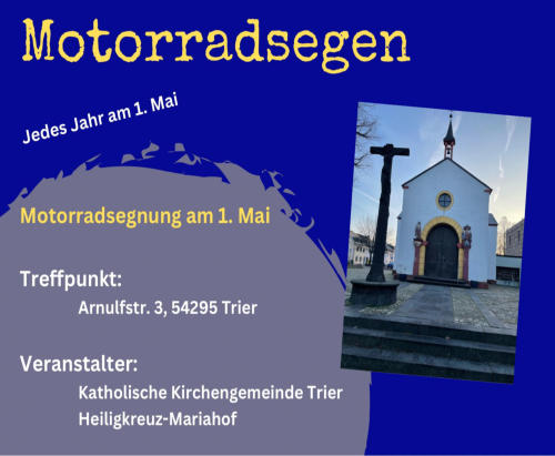 Gottesdienst mit Motorradsegnung im Schönstattzentrum Trier am 1. MaiWie jedes Jahr wird auch in 2026 am 1. Mai wieder eine Motorradsegnung stattfinden. Beginn der Veranstaltung ist 10:00 UhrDieses Jahr werden wir den Startort ändern. Der Treffpunkt ist die Kapelle in Heiligkreuz, in der Arnulfstr. 1 in Trier.Dieses Jahr wird es auch wieder, wie gewohnt, mit den Ausfahrten klappen.